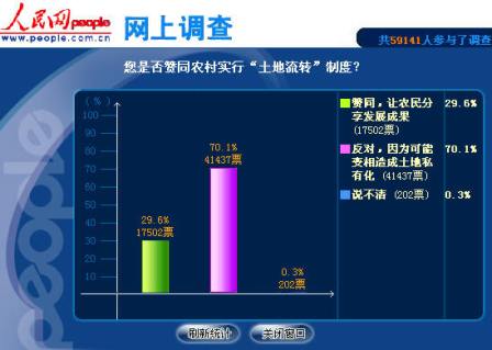 30年改革開放帶來農(nóng)村巨變。十七屆三中全會召開,審議通過了《中共中央關(guān)于推進農(nóng)村改革發(fā)展若干重大問題的決定》,標(biāo)志著我國農(nóng)村改革站在一個新的歷史起點上。其中“土地流轉(zhuǎn)”因為被廣泛關(guān)注和熱議,已經(jīng)成為包括網(wǎng)絡(luò)在內(nèi)的各種媒體的流行詞。中國共產(chǎn)黨新聞網(wǎng)針對“土地流轉(zhuǎn)”推出網(wǎng)上調(diào)查《您是否贊同在我國農(nóng)村實行“土地流轉(zhuǎn)”制度?》,截止到10月20日9:00,共有59141人參與調(diào)查,網(wǎng)友留言278條。