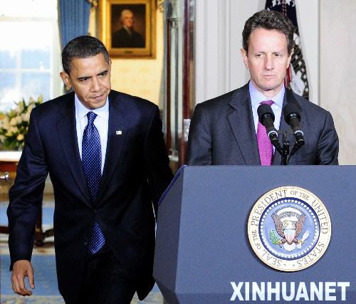 2月4日,美國總統(tǒng)奧巴馬(左)與財(cái)政部長蓋特納在白宮就美國公司高管薪酬問題發(fā)表講話。奧巴馬當(dāng)日宣布,接受聯(lián)邦政府大筆金融救助款的企業(yè)高級(jí)管理人員年薪不得超過50萬美元。 新華社記者張巖攝