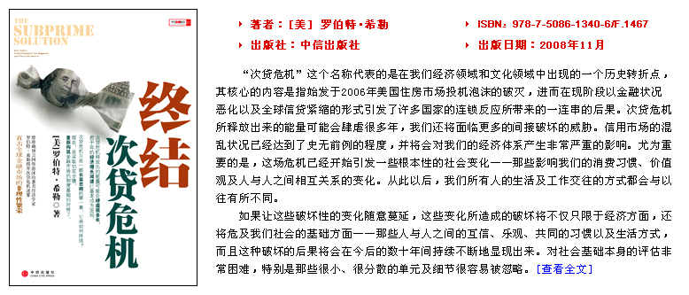 | 希勒的新書對(duì)這次次貸危機(jī)進(jìn)行了深入的分析,為政策制定者、華爾街和全球投資者提供了深入而細(xì)致的參考。 |